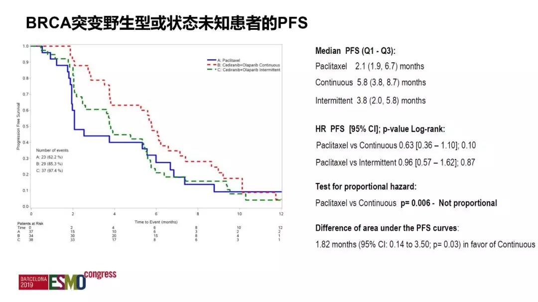 本次ESMO公布的BAROCCO研究显示(图11),针对铂耐药复发患者,奥拉帕利+西地尼布的连续用药方案,对整体人群的疾病控制率(完全缓解+部分缓解+疾病稳定)达到84.6%(化疗对照组为54.1%)(图12)。奥拉帕利联合西地尼布对gBRCA突变阴性的铂耐药复发患者也具有明显疗效,中位PFS延长至5.8个月(化疗对照组为2.1个月)(图13)。